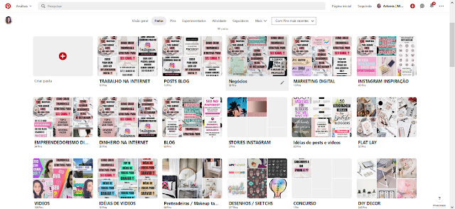 Você pode criar pastas específicas de assuntos que você gosta, por exemplo, no meu perfil você encontra pastas de CABELOS, MEUS VIDEOS DO YOUTUBE, EMPREENDEDORISMO DIGITAL, DIY, RECEITAS, e por ai vai … O número de pastas é ilimitado e você consegue segmentar e organizar todas as imagens!!!